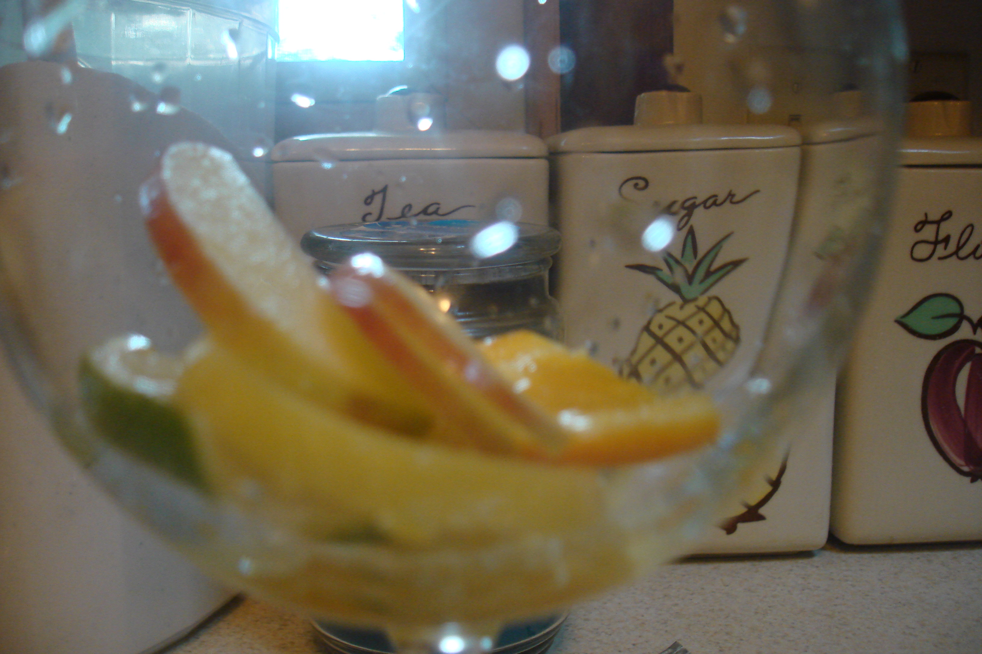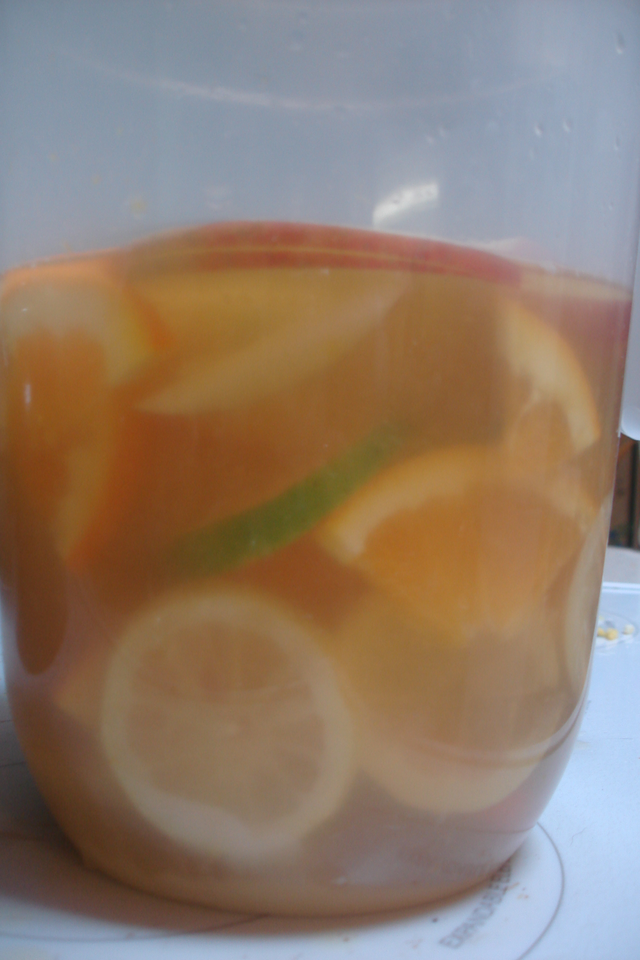 I know when you think sangria you’re probably picturing red, but let me tell you white is so yummy too! And for summer months, it definitely is pretty much perfection! I’d only heard (or had) red wines in sangrias previously, but when I googled how to make them and found hundreds of recipes, the one that stood out the most was a white one. That was the only thing I used from their recipe (true to my typical form!). One of the reasons I love sangrias so much is the simple fact that it’s a good way to use leftovers! Any wine will do, it doesn’t have to be expensive and they don’t have to be the same brand even. If you have any opened wines, this is a great way to get them used up and not let them go to waste! I had a bottle of chardonnay and 2 half bottles of Pinot. Together it was about 2 quarts. Then I cut tons of fruit (oranges, apples, lemons, and limes) in slices. I seeded them (I didn’t want anyone choking on our girls’ night!) and then sqeezed the juice out of them (and into the pitcher). I used about 4 lemons, 4 limes, 3 big oranges, and 2 big apples.
