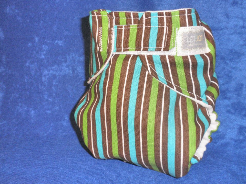 One of my favorite things about cloth diapering is all the options. Whether it’s that you’re going for your cheapest options or set out to find the cutest diaper possible… it’s there, in large quantities! Another bonus, hubbyman and I try our best to buy local and we believe it does matter where things were made- and there are lots of diapers that are made by what are referred to as WAHMs (work at home moms). The quality is excellent! My favorite WAHM diaper-maker is LetJoy Cloth Diapers. Her diapers are so cute, and her liners are more absorbent than most of my mass manufactured ones! Seriously, she tested her overnight liner, and it held over a cup 1/2 of water! In fact, I often use it on diapers other than hers, because it is so absorbent- I love it so much!  Not only does she have a growing inventory but she can do made-to-order as well, like Littlest E’s super cute (and hubbyman’s favorite):