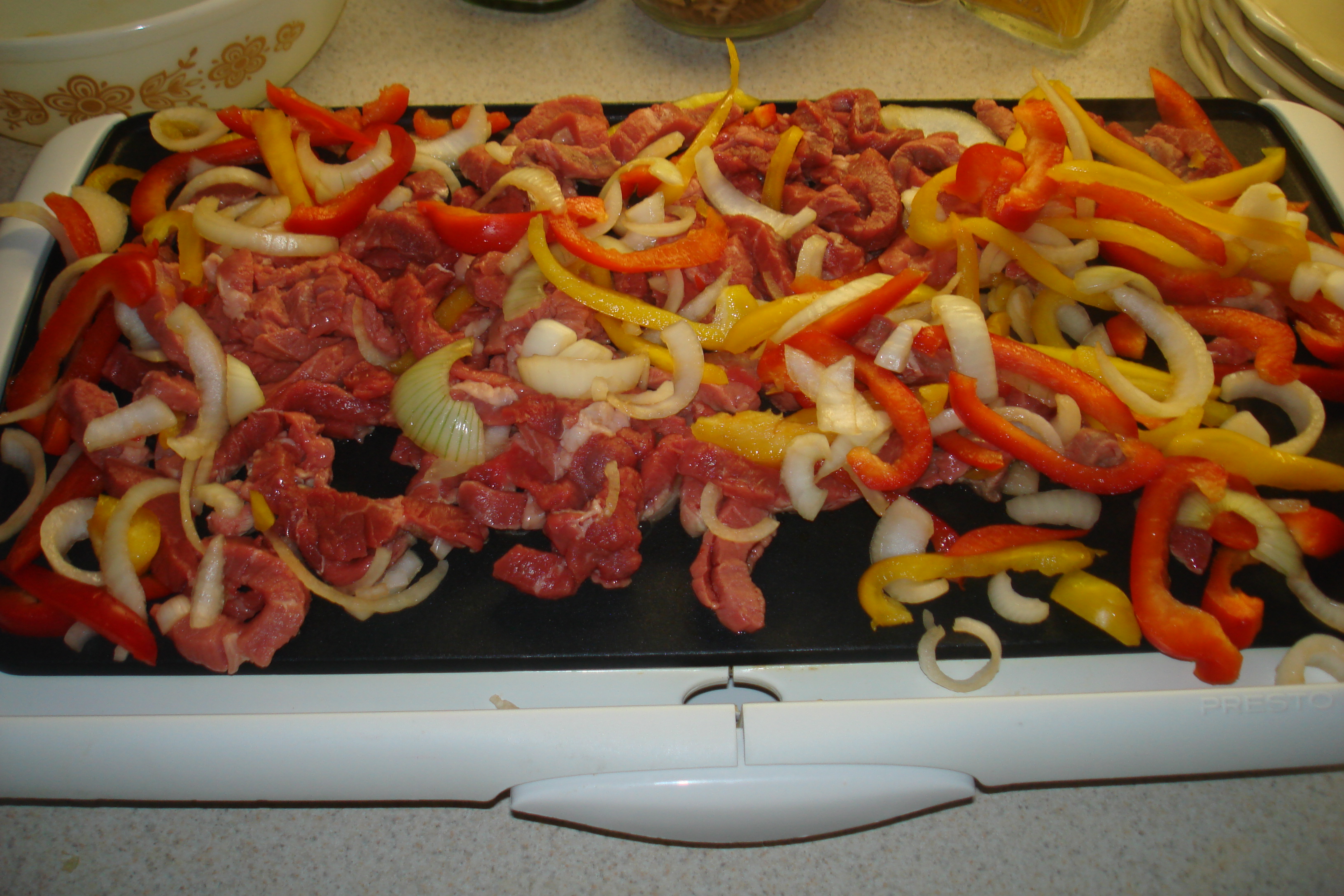 Slice the beef, peppers, and onions in thin strips.